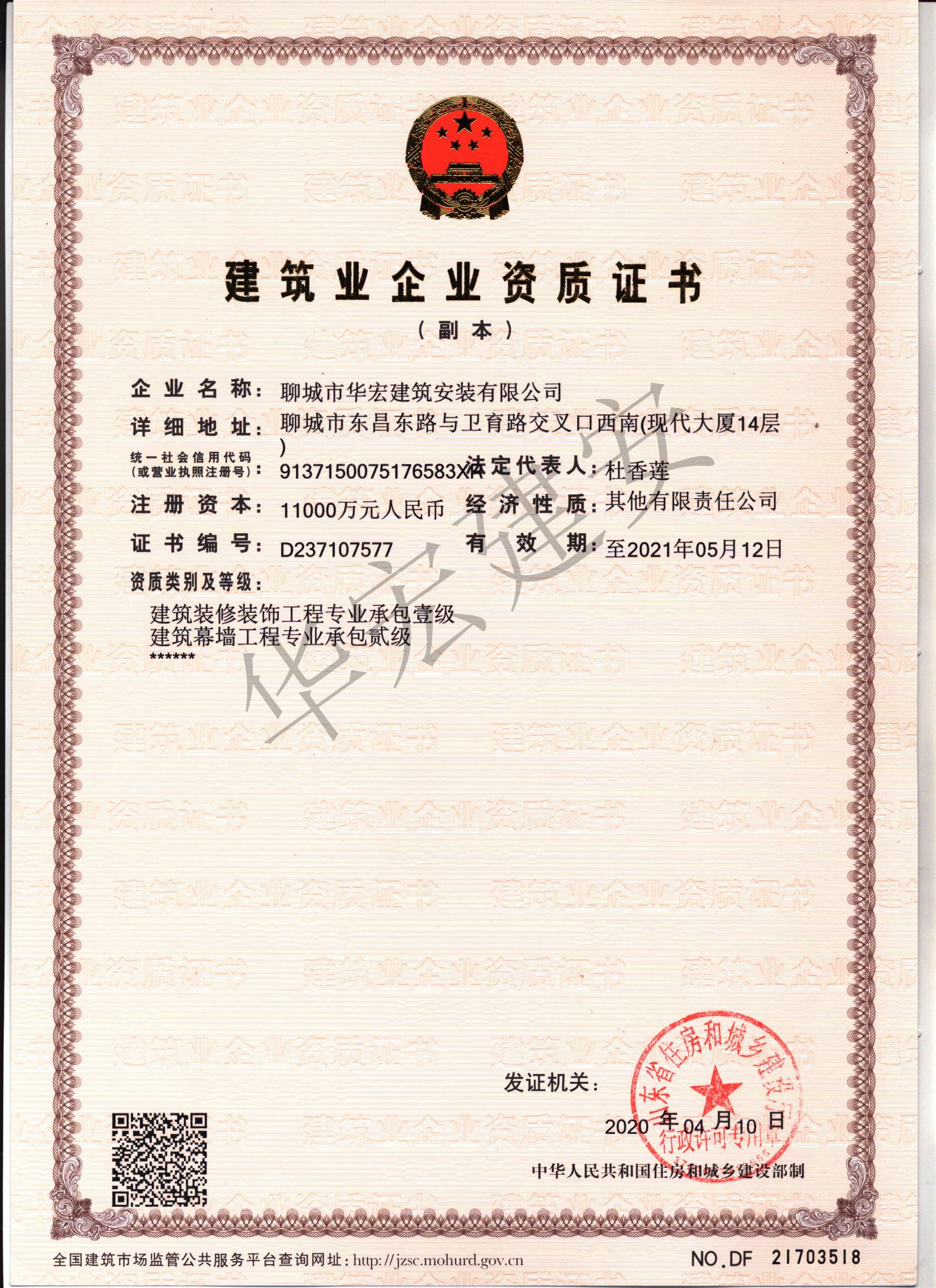 聊城市華宏建筑安裝有限公司成立于2002年5月,公司自2002年成立以來,不斷發揚 “敬業修身 打造精品 開拓創新 弄潮勇進”的創業精神,始終遵循“以質量求生存、靠精品創品牌、憑信譽贏市場”的宗旨,認真奉行“科學 高效 一流”的質量方針